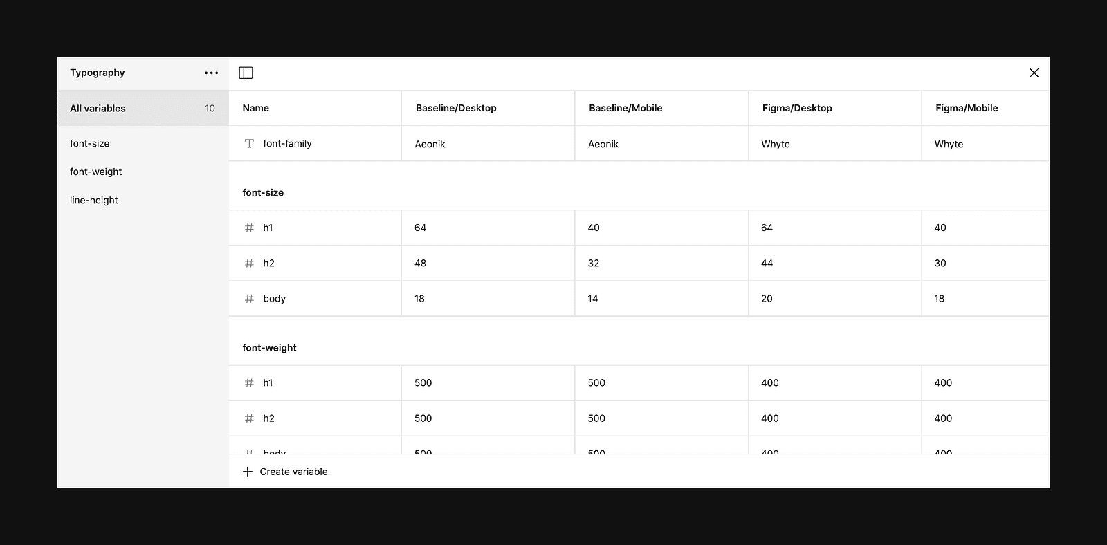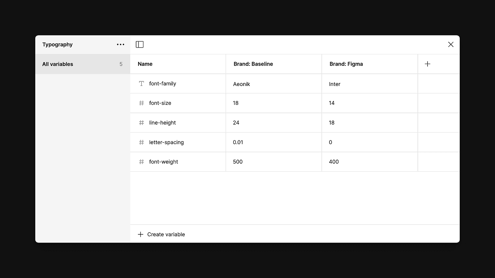 As an example of how this all works, let’s imagine I’m working on a component library within Figma that supports two different brands: my little company, Baseline, and Figma. Within the variables modal, I created a new collection called Typography, and inside this collection, I have five variables: font-family, font-size, line-height, letter-spacing, and font-weight. To support the different brands, I’ve also created two modes: one for Baseline and one for Figma. The font-family variable is a string variable, as this will help us store the name of the font we’d like to use for each mode, while the rest of the variables are numbers with their values defined.