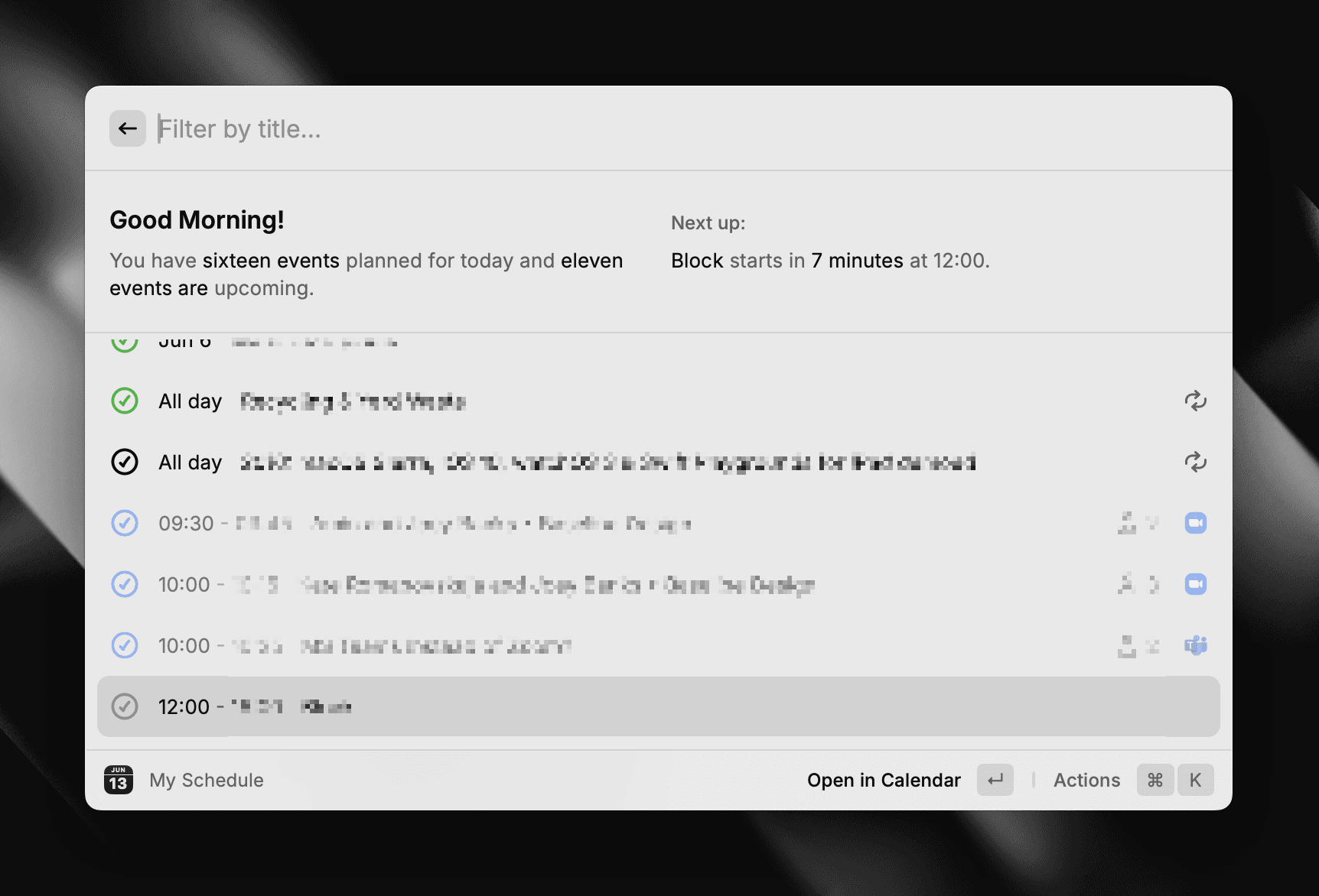 Another recent discovery is the calendar extension, which connects to your Mac’s Calendar and displays everything that’s up ahead. Simple enough, but what I love about this one in Raycast is its ability to place the upcoming event in your Mac’s Menu Bar and allows you to preview yourself on video before joining. It's a small thing, but this extension can go a long way when you’re on video calls all day!