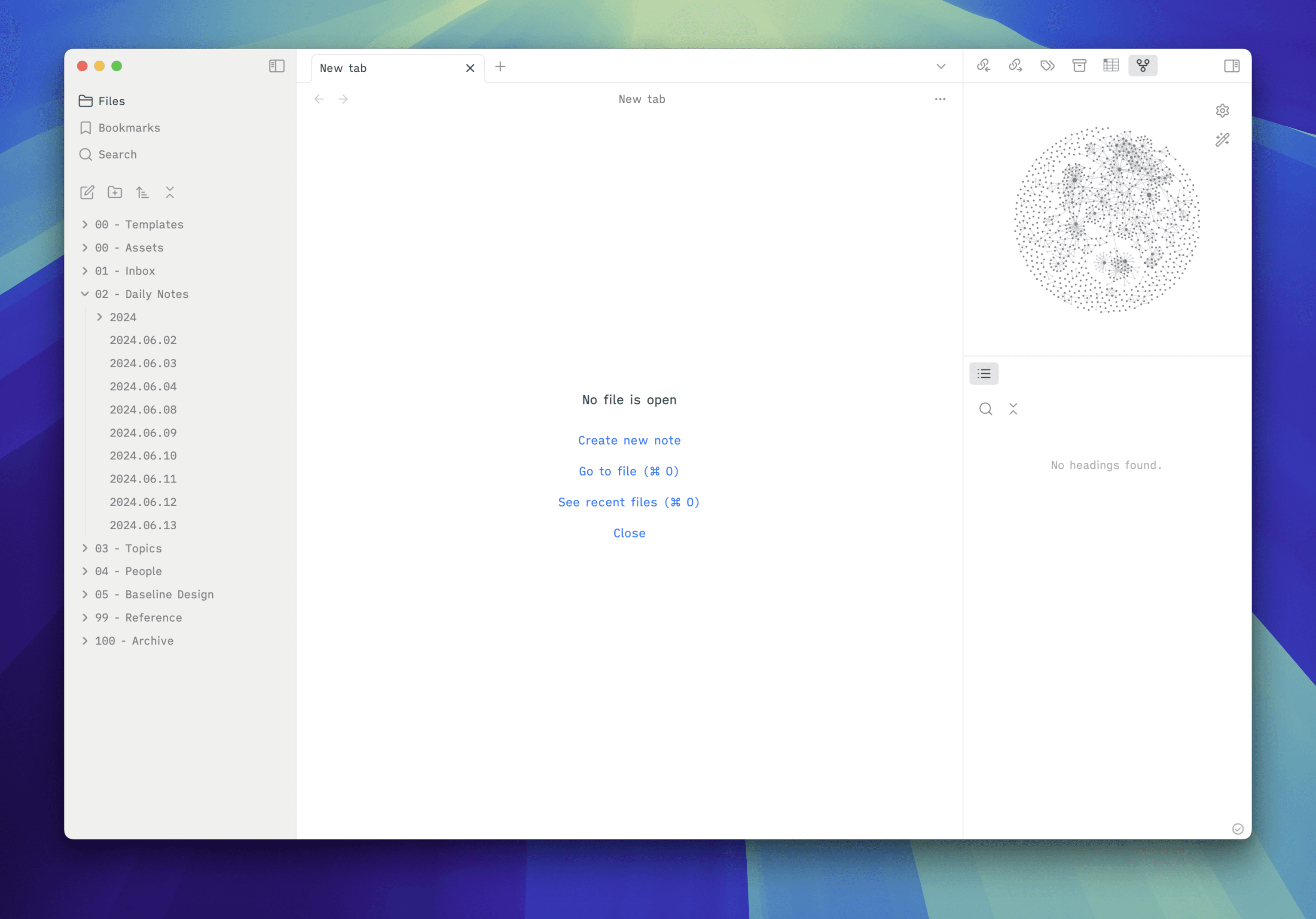 I realized I could accidentally write a lot within this section of the post, so rather than spilling thousands of words here, I’d love to quickly share what my setup in Obsidian looks like to give you an idea of what it can do. Within my Obsidian space, I try to keep notes within folders as much as possible, and organization starts with nine folders: Templates, Assets, Inbox, Daily Notes, Topics, People, Baseline Design, Reference, Archive. Within each of those folders (330 in total) are dozens of other folders to help me store all of the 1,100 notes I have within my Obsidian Vault.