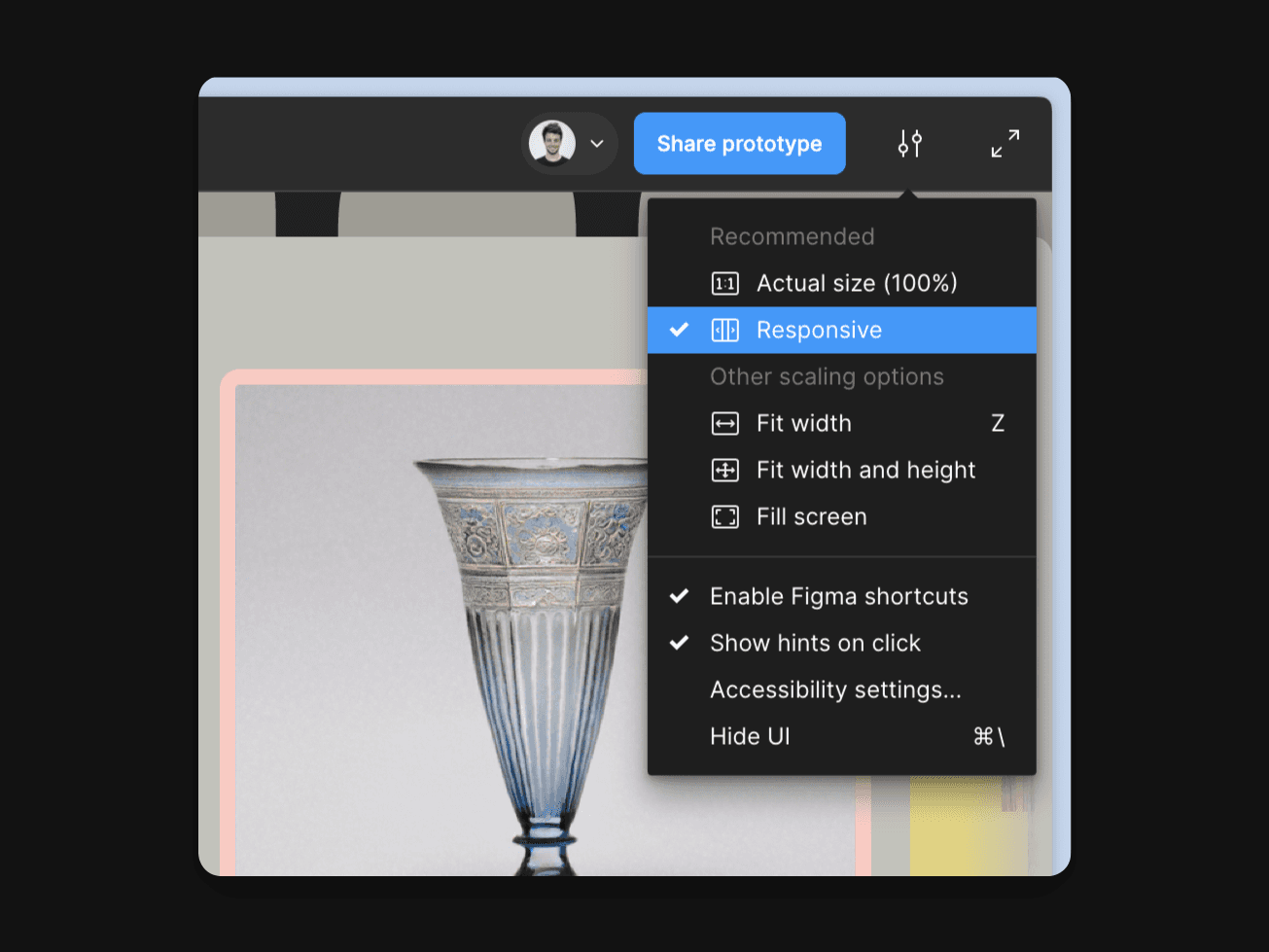Developers can also now view prototypes in a responsive view, allowing those inspecting to see how the design reshapes and resizes based on the screen’s width. When I first heard Figma mention this, my first thought was in hoping that this feature would come to Prototyping by default, and we now know that it does! When you’re in a prototype, tap Responsive within the prototype settings menu.