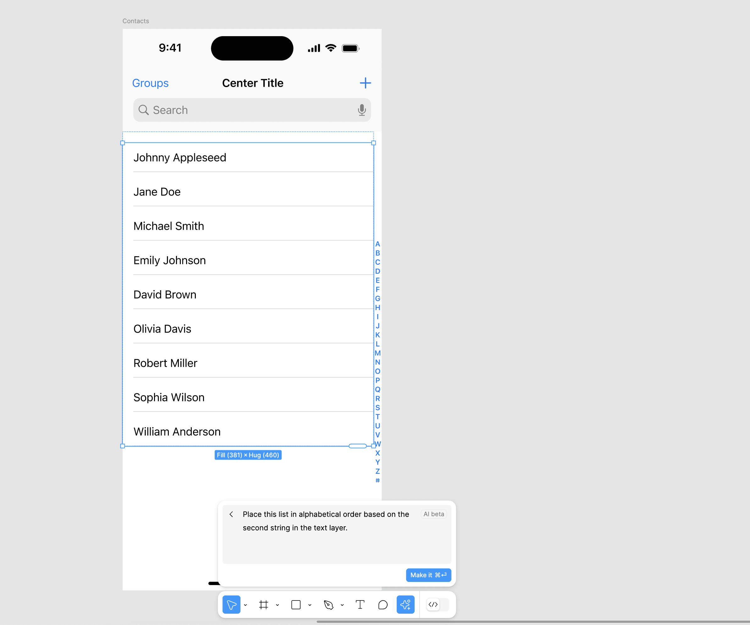 I populated each name with Figma's Replace Content Tool in the design below, and with any auto layout group with repeating frames inside, the Replace Content tool can run. I did try to make a change, asking to place them in alphabetical order based on their last name. This query worked several times but failed a few times, which is to be expected here and there.