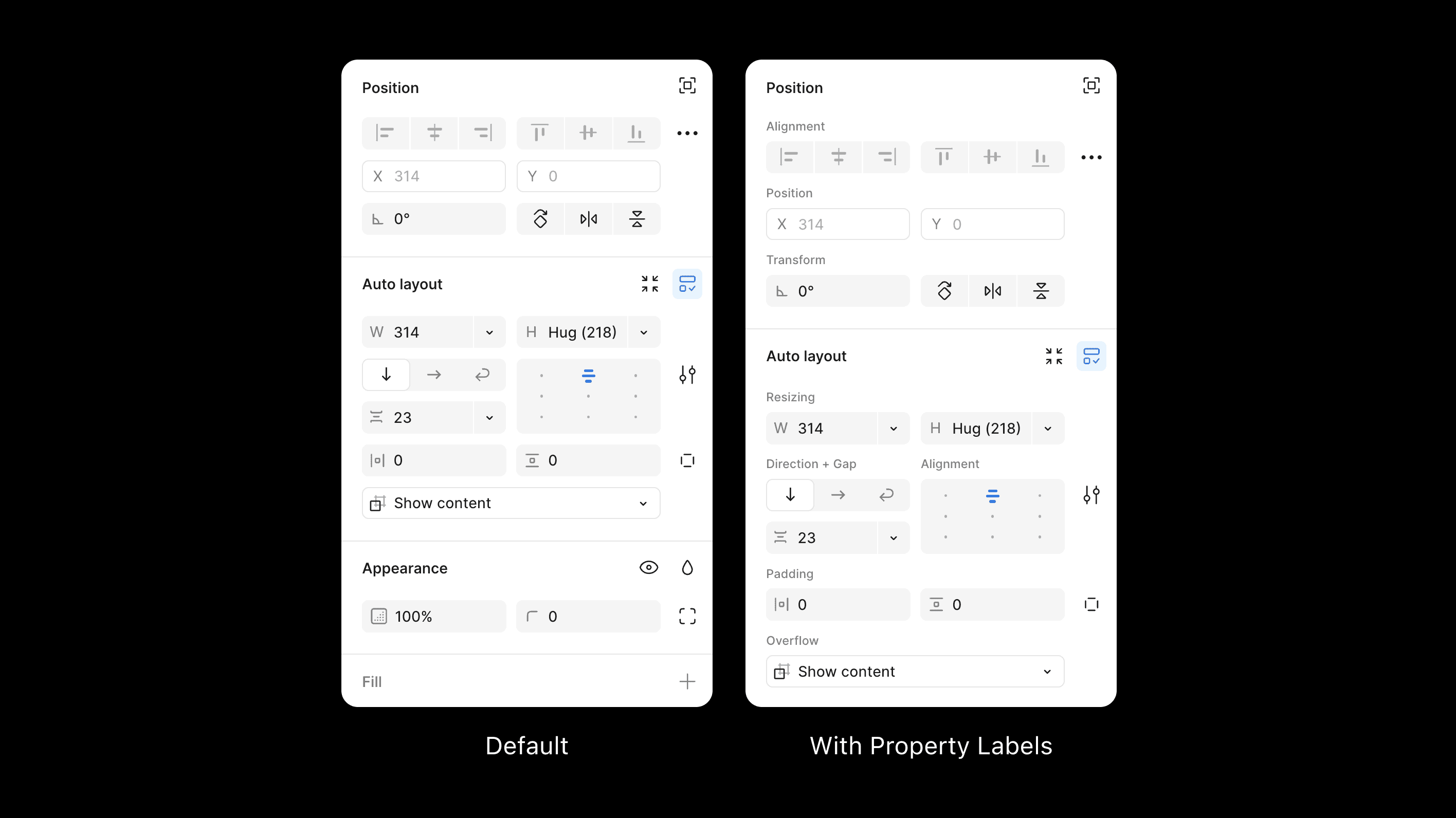 For those working in design systems and everyone using components from libraries within Figma, one of my favorite updates with this refresh is the repositioning of component variants and property controls. These controls are no longer seated halfway down the Property Panel but are now near the top, with more of the component description visible. And because the Property Panel can now resize, meaning its width can finally increase or decrease, it’s much easier to see more of the variant or property label, too! 👏