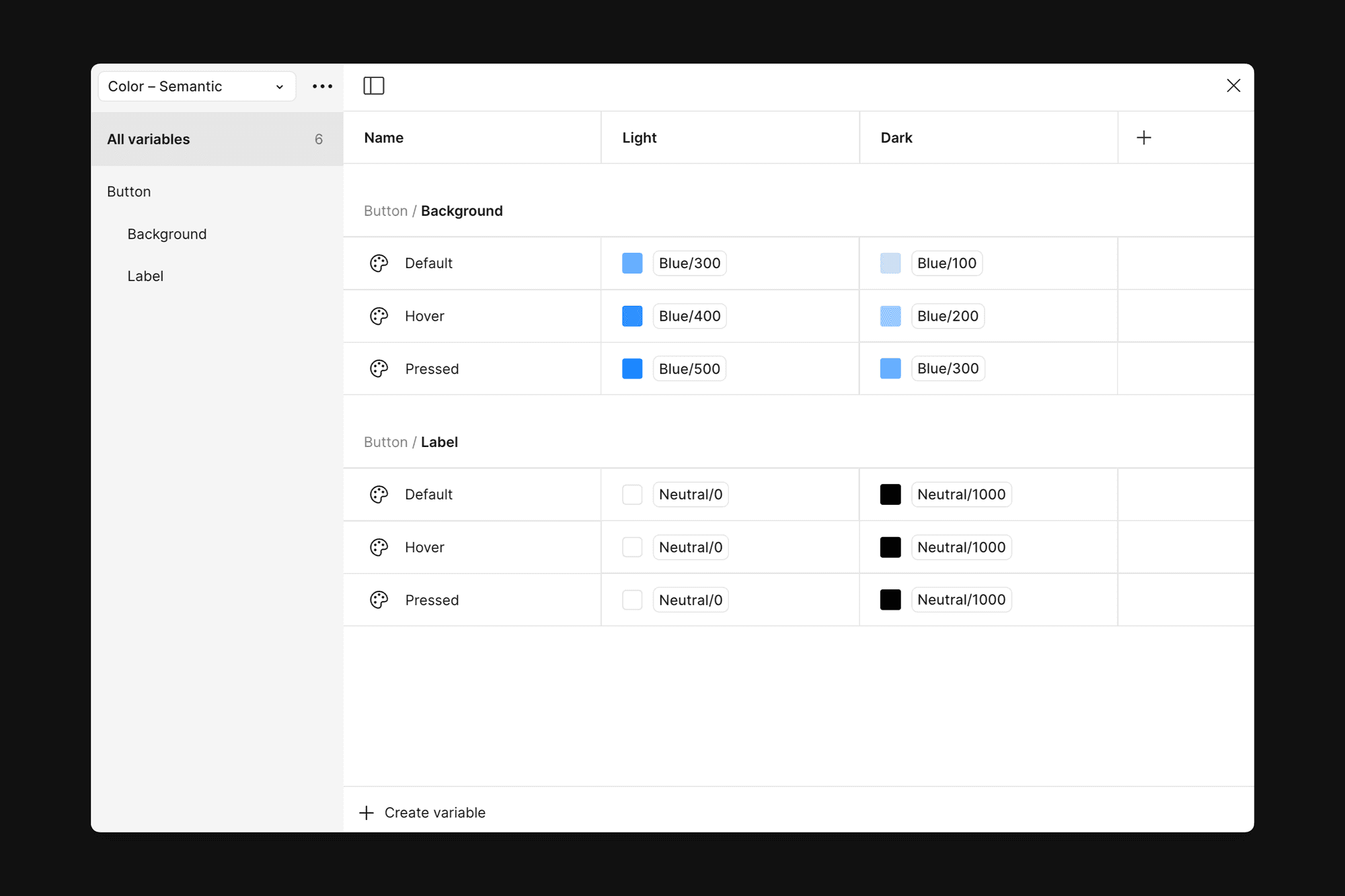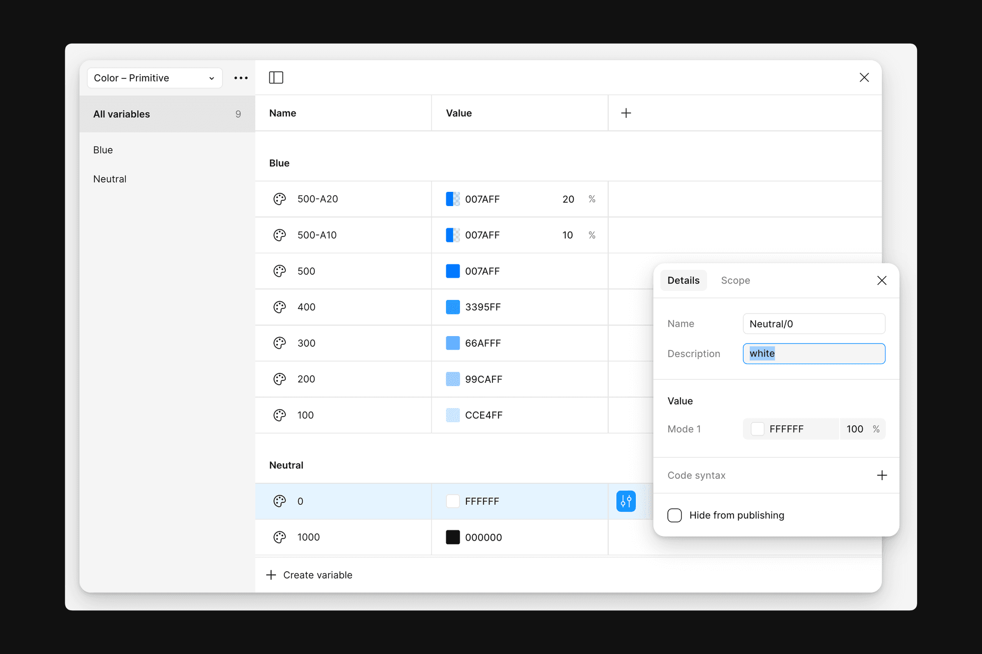 📝Tip: If a variable represents a common color, like white or black, I recommend including that color in the variable’s description. This makes it easier to search for ‘white’ or ‘black’ later, rather than remembering and typing something like ‘Neutral/0'.