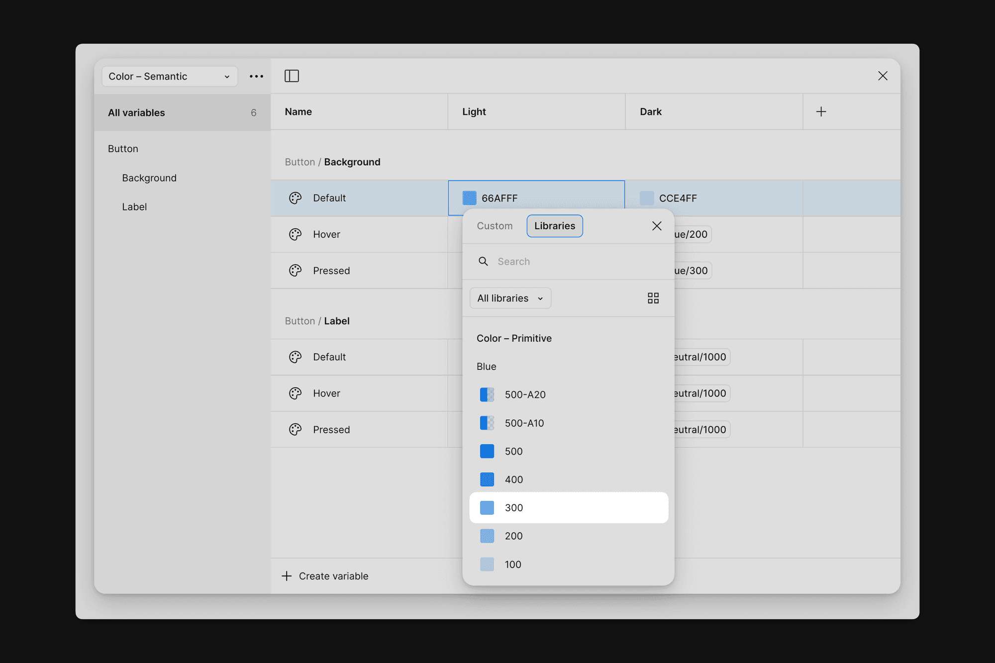 In Figma, this process is known as aliasing, which allows us to link a new variable’s value to an existing one within our system. For example, I’ve created a new variable named Button/Background/Default within this Color – Semantic collection. At the moment, it uses a hex value to define the color, but by clicking on the variable’s color swatch and navigating to ‘Libraries’ at the top, we can map this variable to Blue/300, linking it to the same color value.