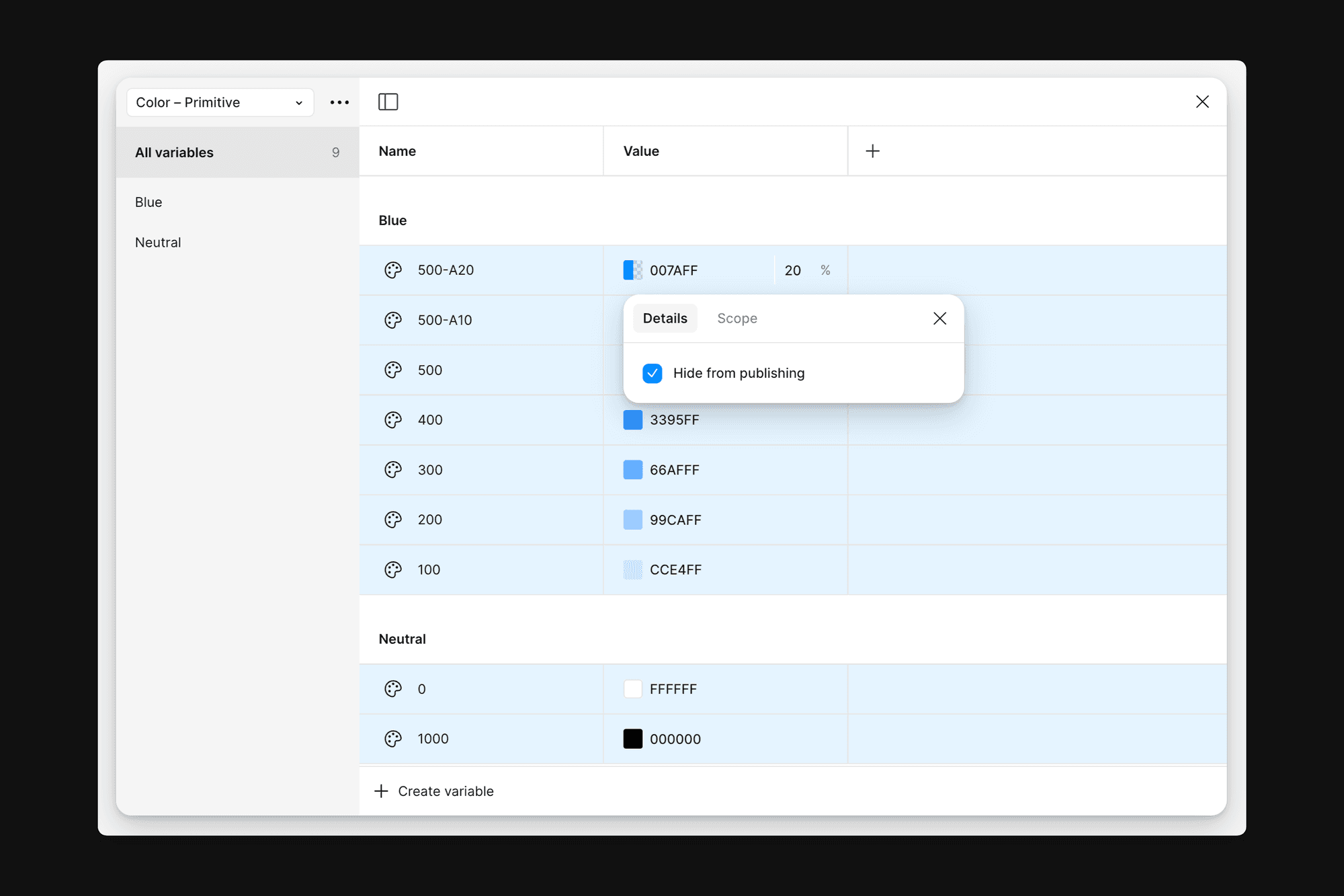 To make an entire collection private, such as the Color – Primitive collection, we can add an underscore or period to the start of the collection’s name. Additionally, we're again able to select all variables within the collection and use the same ‘Hide from publishing’ option.