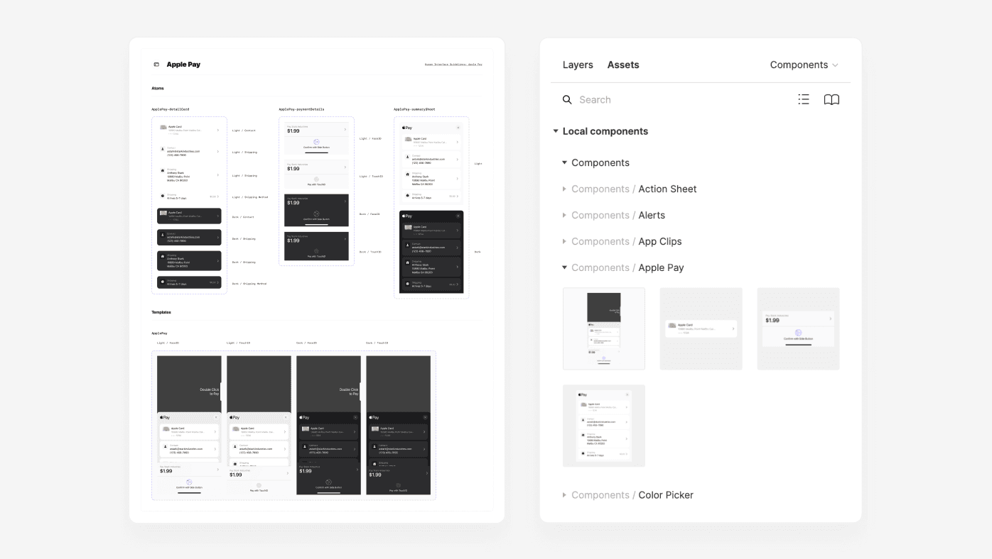 For example, in my iOS UI Kit for Figma, I created four components related to designing for the Apple Pay interface. By placing a frame named "Apple Pay" around each of those four components, the Assets Panel now shows each of those four components under a new dropdown with a name that matches the frame's title.